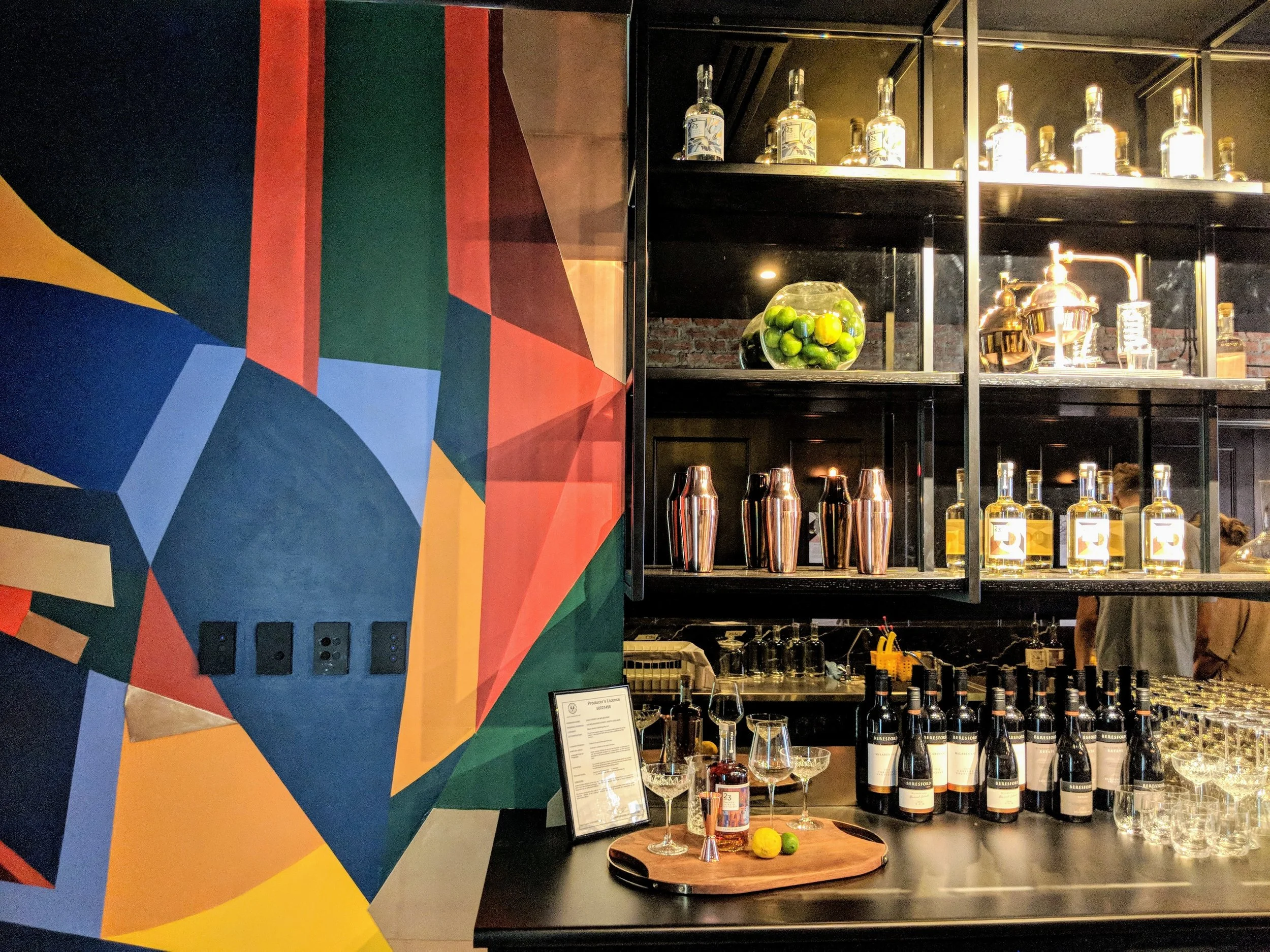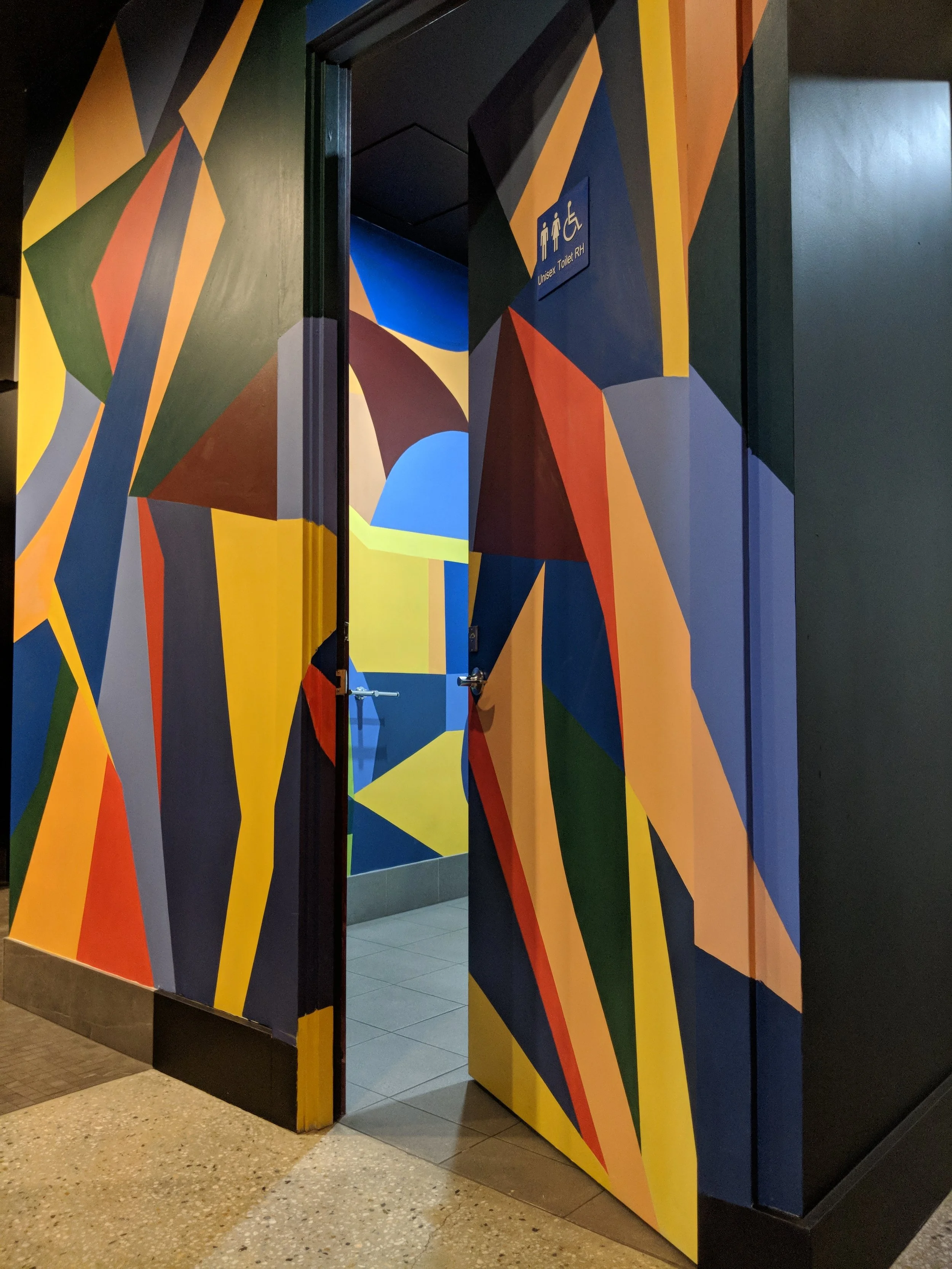 The mural unfolds across the bar’s interior in a dramatic display of geometric abstraction. Rich tones of deep green, navy, burgundy, and burnt orange evoke warmth and depth, while vivid highlights in gold and yellow offer contrast and vibrancy. The result is a layered, immersive artwork that energises the space without overpowering it.