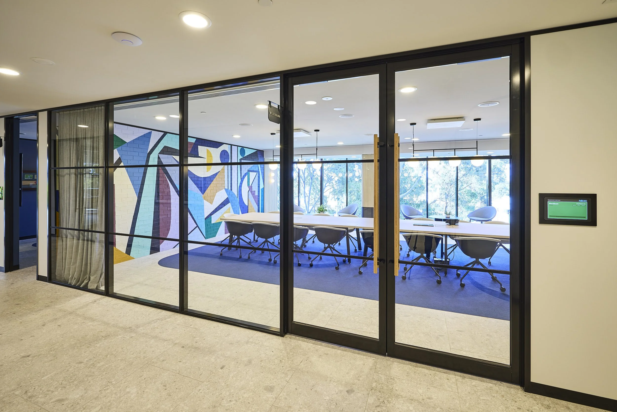 The palette is refined and architectural - slate blues, warm ochres, deep burgundy, soft mint, and neutrals; offering a contemporary tone that complements the boardroom’s interior finishes. The mural not only enhances the space but reinforces Pellicano’s identity as a design-forward, detail-driven development firm.