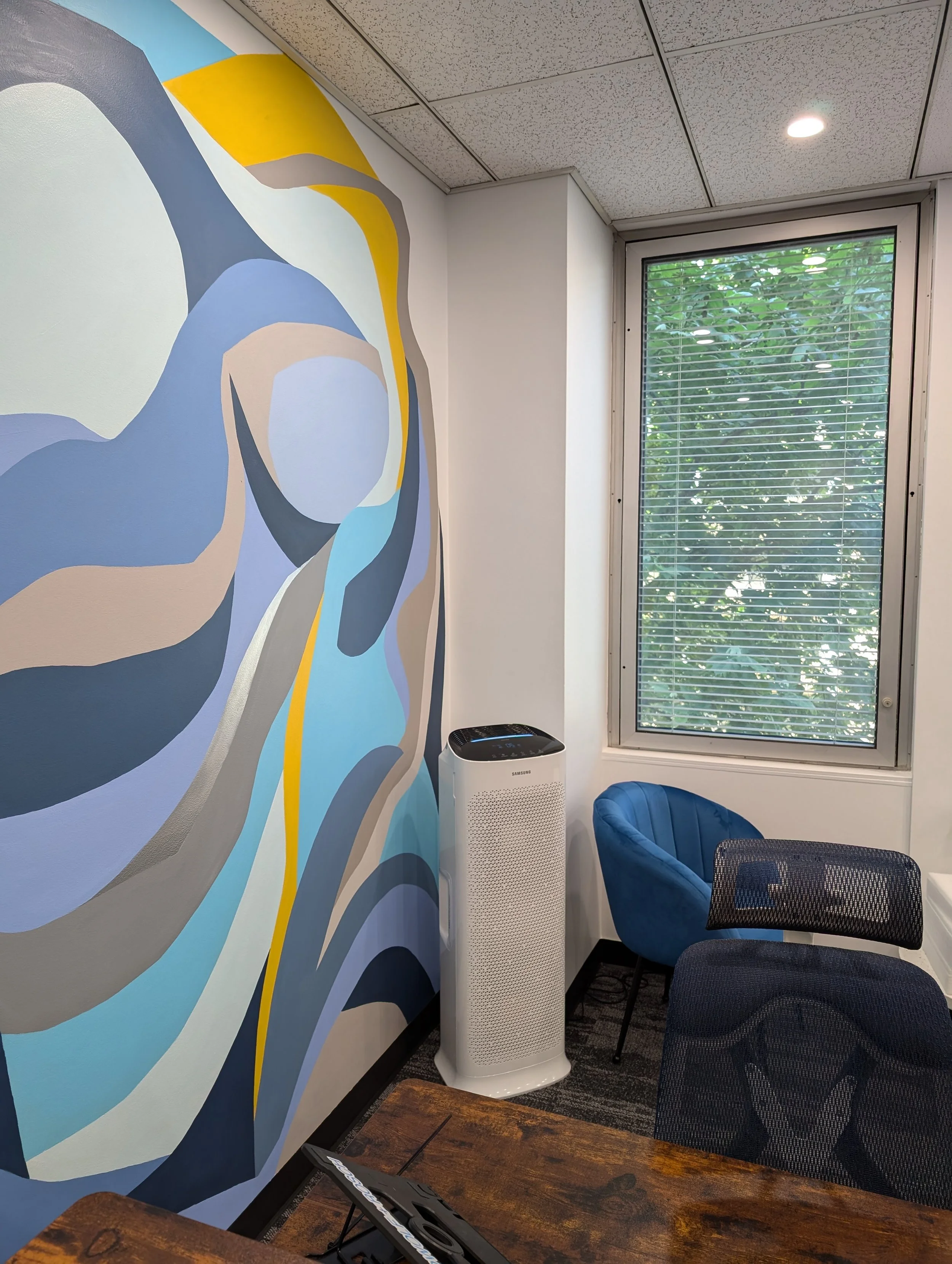 The feature mural at the far end of the office draws inspiration from the movement and rhythm of water. Fluid forms in tones of cobalt, sky blue, grey, and soft white swirls across the wall, creating a visual current that evokes clarity, focus, and momentum; an abstract nod to both Adelaide’s coastal identity and the dynamic pace of a thriving creative agency.