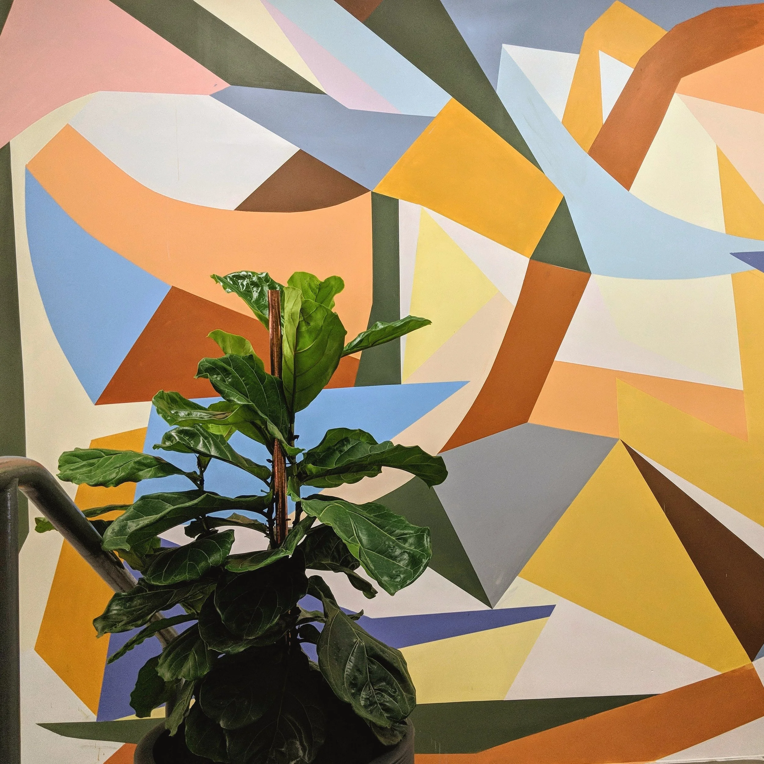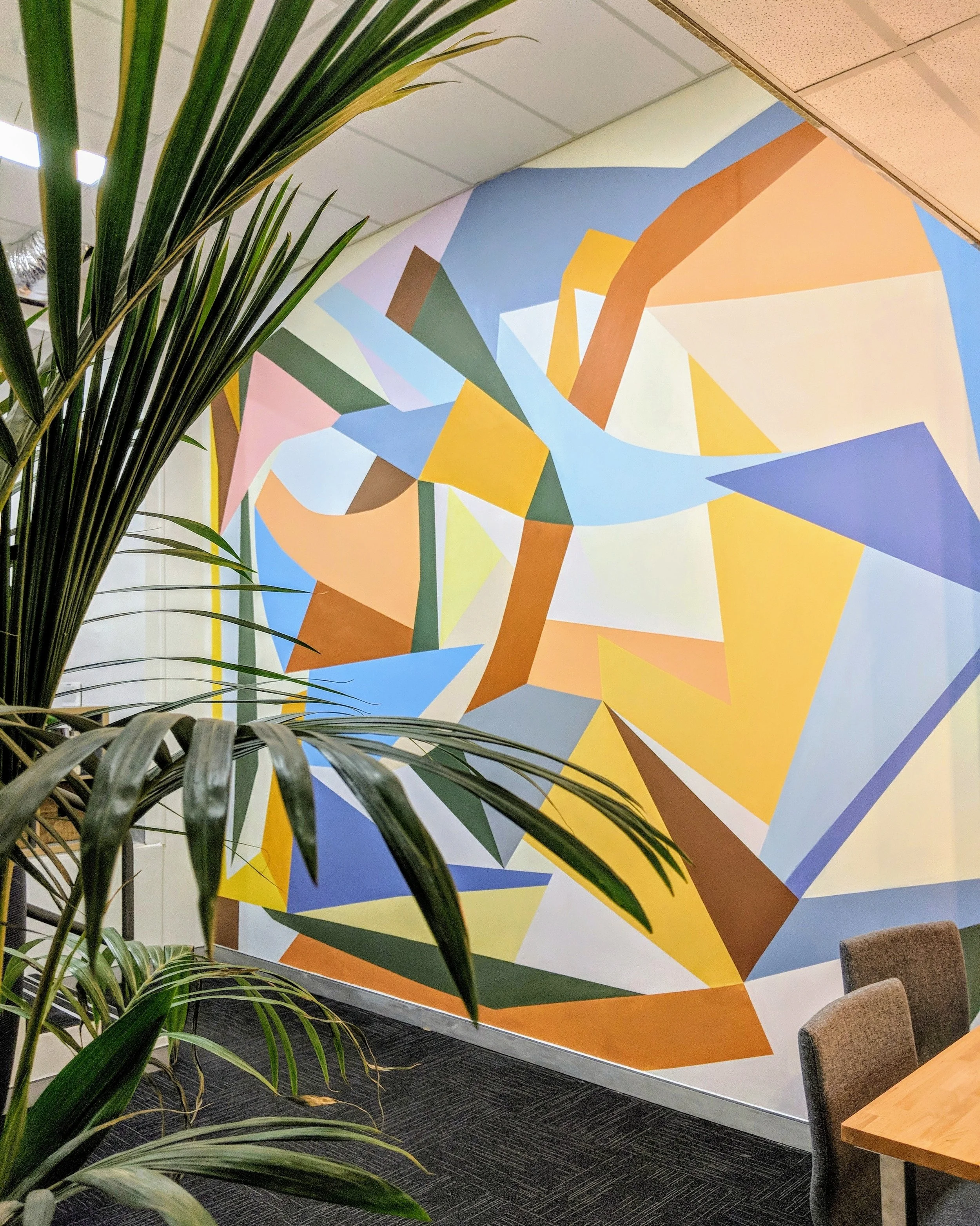 Each wall composition employs geometric abstraction, with flowing angles and layered planes that guide the eye and create a sense of movement. The forms feel organic in their arrangement with interlocking shapes suggesting collaboration, progress, and connection, all qualities central to co-working culture. These abstract gestures gently animate the walls, transforming what could be stark office corners into zones of creativity and calm.